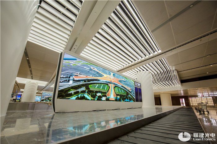 在大兴机场内,联建光电LED显示大屏以『高密度、高清晰、高精准』等特点完美展现了机场良好风貌,为旅客人群带来舒适视讯体验。